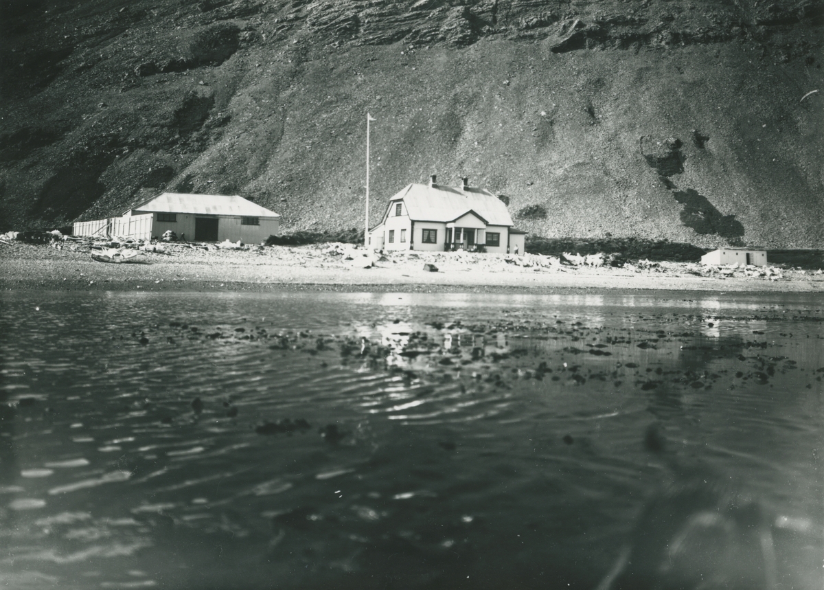Bild från expedition i Antarktisområdet. Motiv av hus på strand på King Edward's Point, Sydgeorgien.