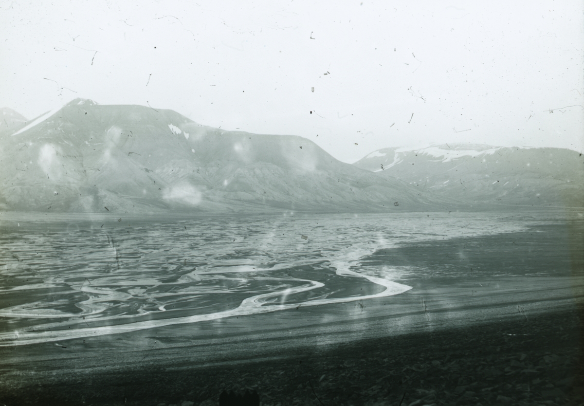 Fotografi från Spetsbergen. Vy över istäckt bergslandskap.