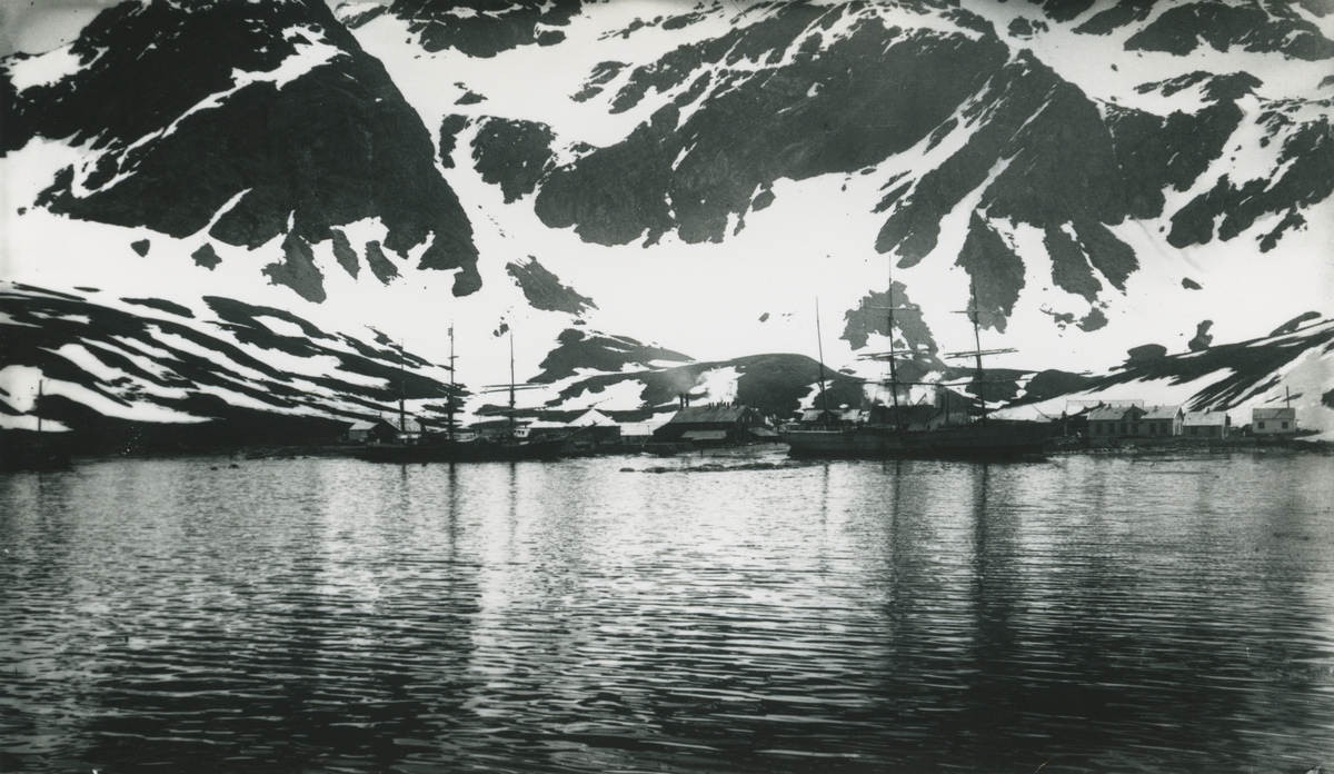 Bild från expedition i Antarktisområdet. Motiv av hav, hamn och snötäckt berg.