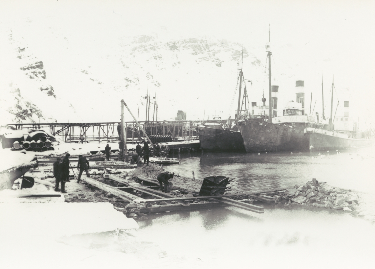 Bild från expedition i Antarktisområdet. Motiv av hamn, båtar och hamnarbetare i Sydgeorgien.