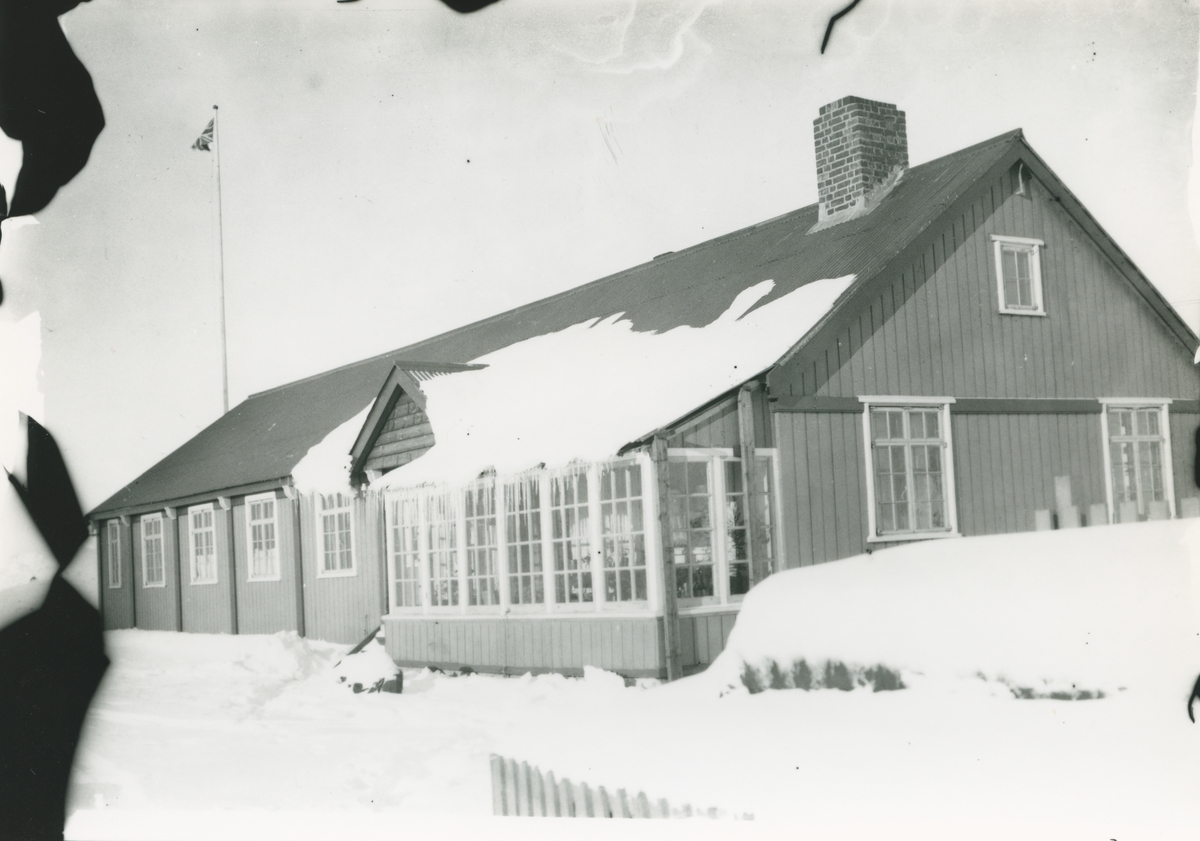 Titel: Bild från expedition i Antarktisområdet. Motiv av hus i snö.