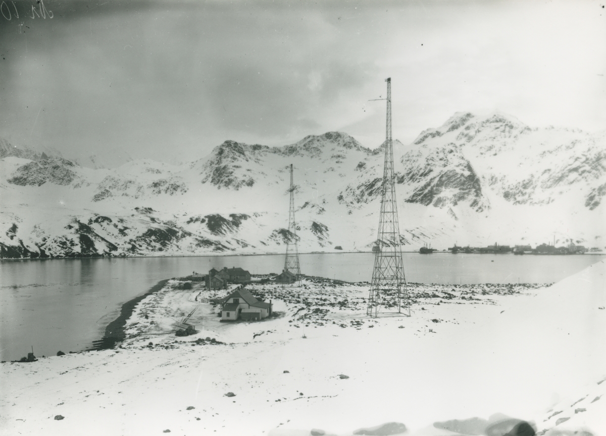 Bild från expedition i Antarktisområdet. Motiv av liten hamn bland snötäckta berg.