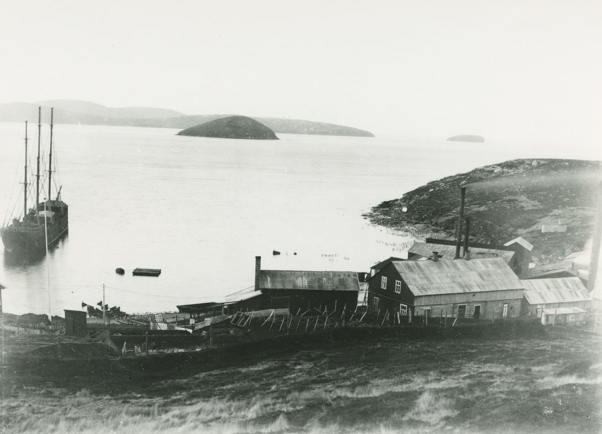 Bild från expedition i Antarktisområdet. Motiv av hus, hav och båt.