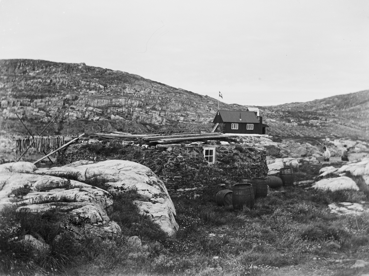 Fotografi från Grönland. Motiv av hus i bergslandskap.
