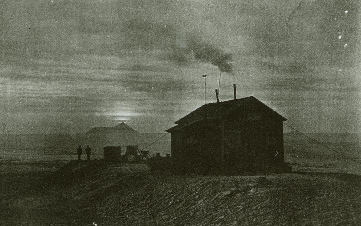 Fotografi från Grönland. Motiv av män vid hus på strand.