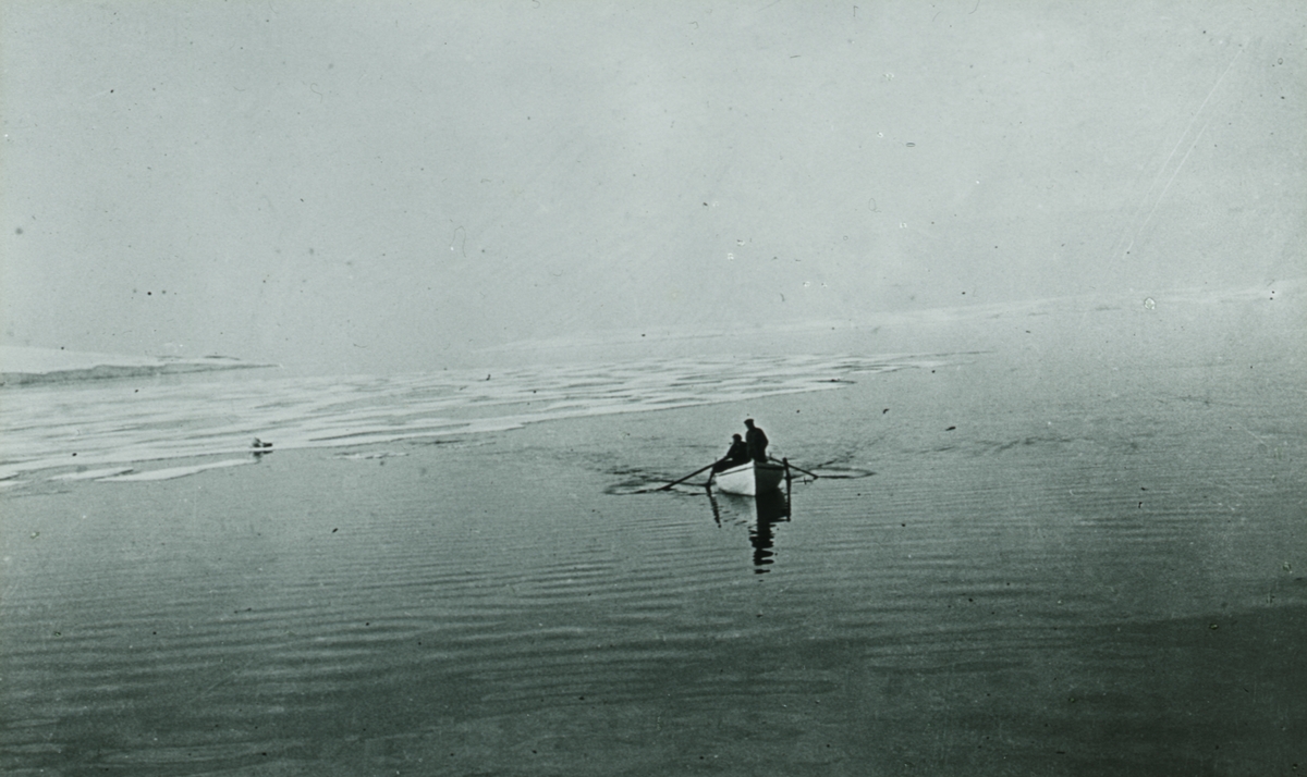 Fotografi från Spetsbergen. Motiv av män i båt på istäckt hav.