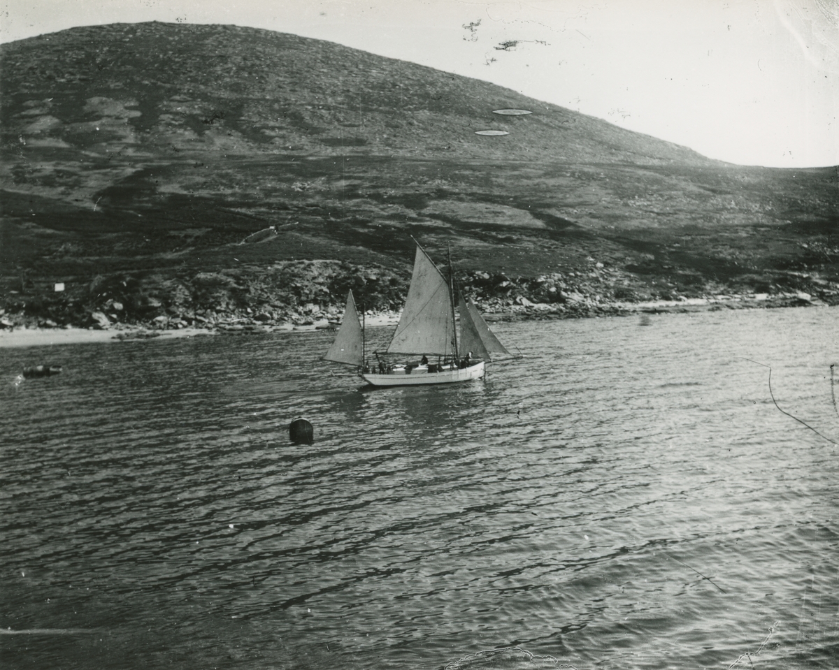 Bild från expedition i Antarktisområdet. Motiv av segelbåt i hav nedanför berg.
