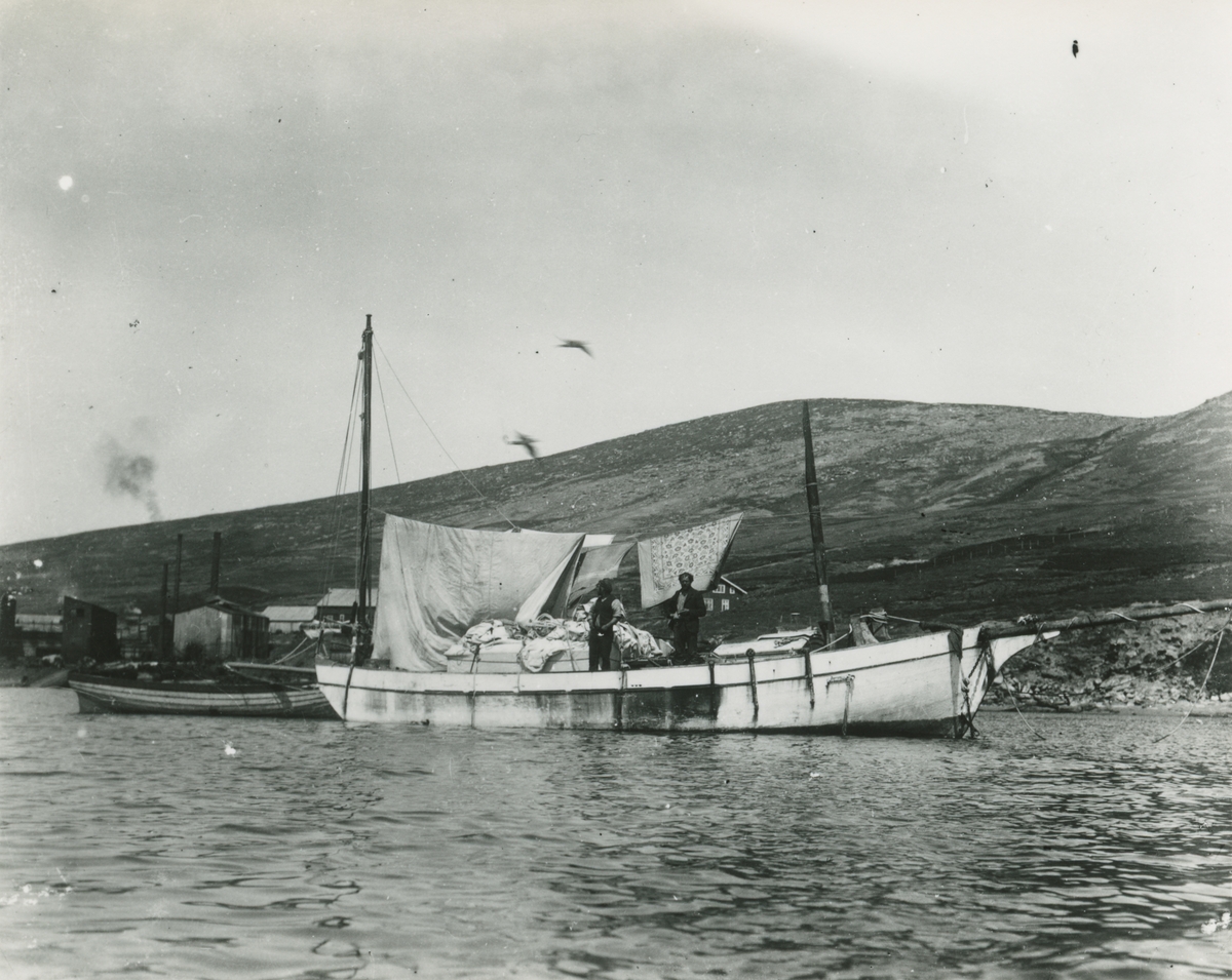 Bild från expedition i Antarktisområdet. Motiv av två män i båt vid hamn.