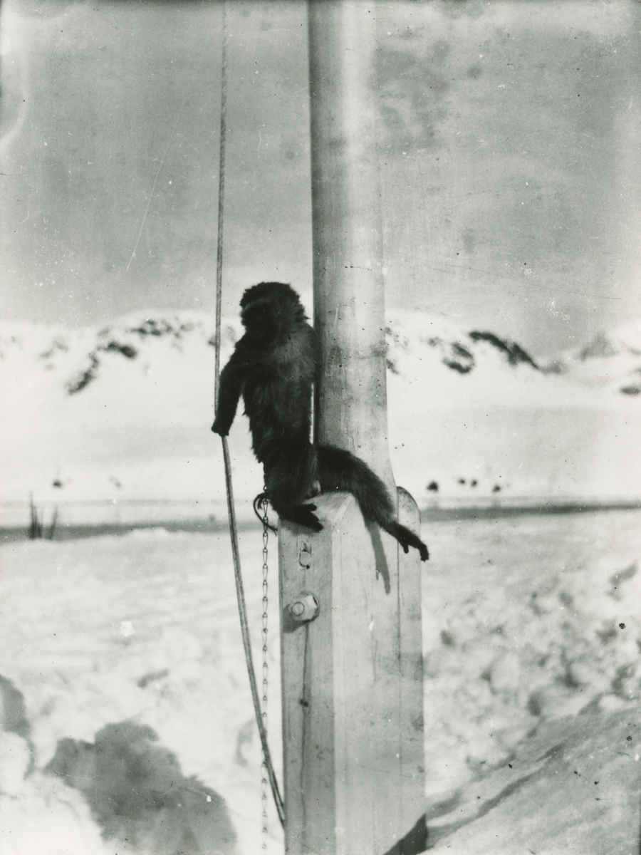 Bild från expedition i Antarktisområdet. Motiv av liten apa på flaggstång i snölandskap.