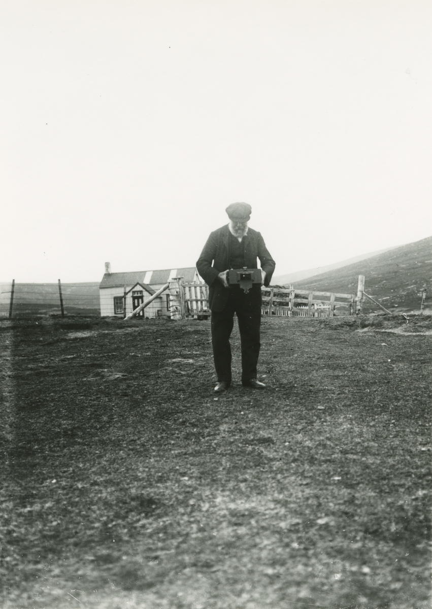 Bild från expedition i Antarktisområdet. Motiv av man med kamera framför hus.