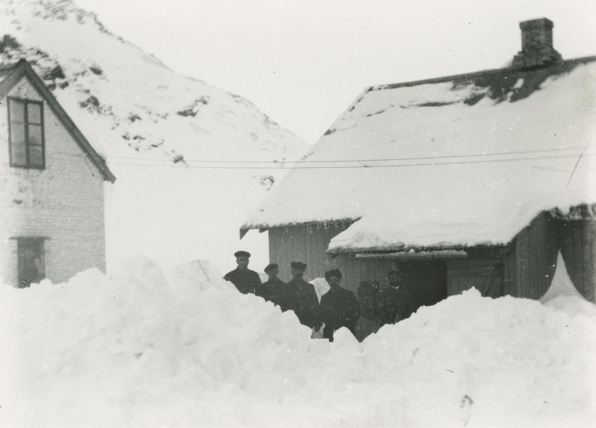 Bild från expedition i Antarktisområdet. Motiv av en grupp män vid insnöade hus.