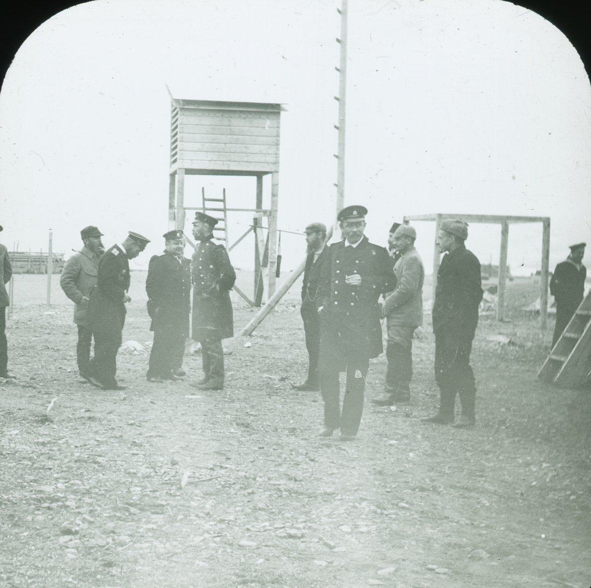 Fotografi från expedition till Spetsbergen. Motiv av en grupp män vid husbygge.