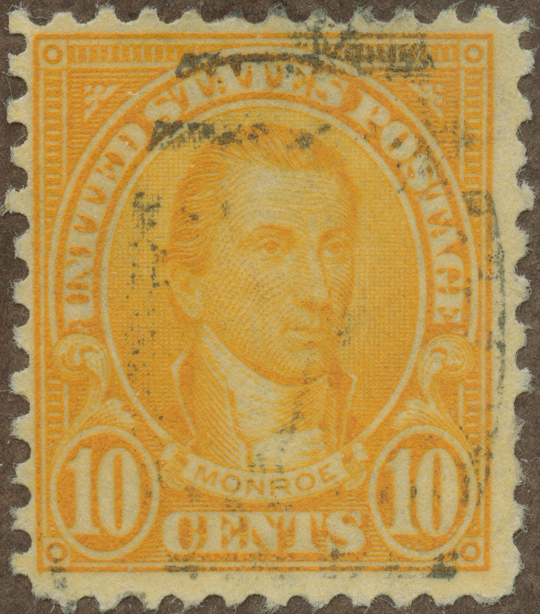 Frimärke från U.S.A., 1923. Motiv av James Monroe: 1758-1831 USA:s 5-te president: 1817-25. Avslutade inköpet av Louisiana distriktet 1803. "Monroe-Doktrinen" 1823. 100-årsminne 1823-1923.