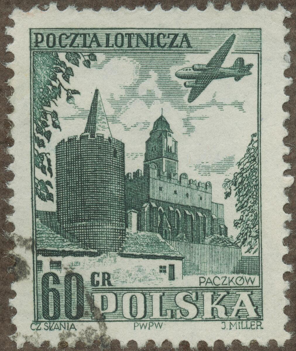 Frimärke från Polen, 1954. Motiv av Staden Paczkow i Polen