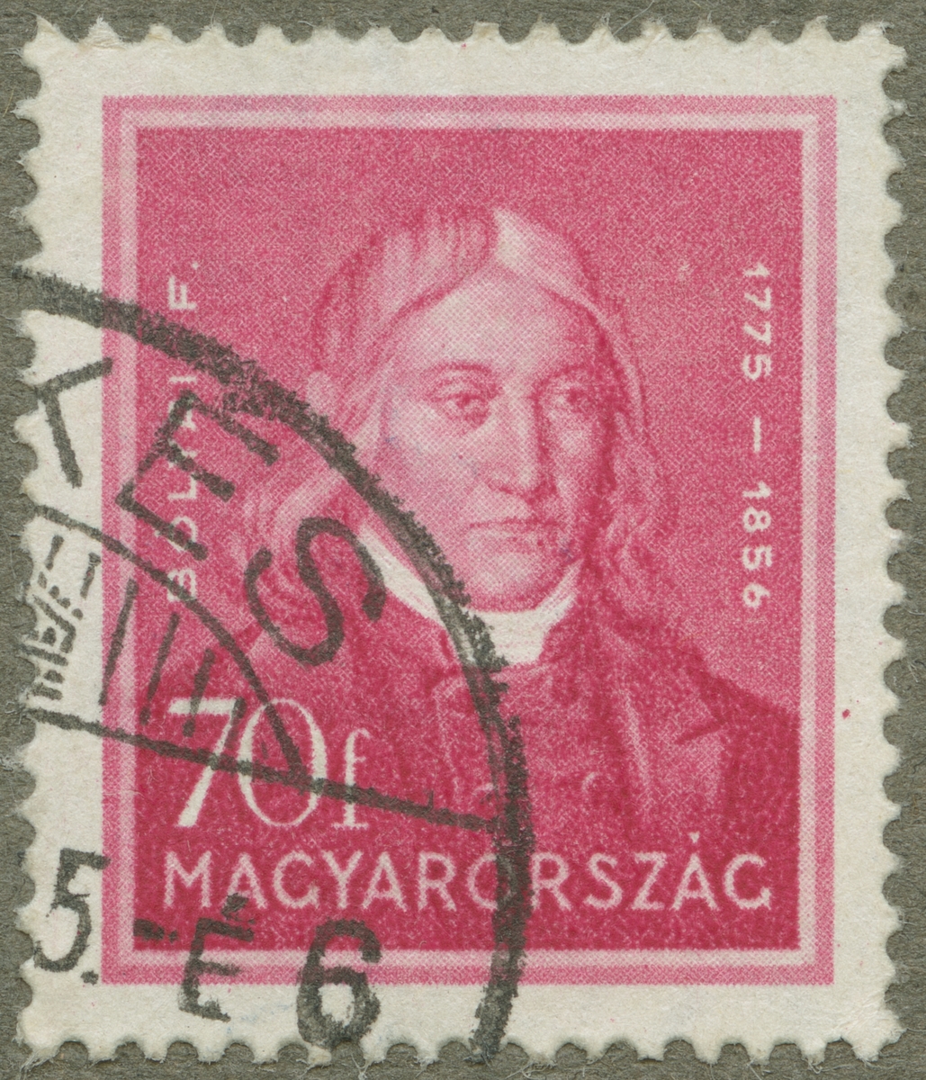 Frimärke från Ungern, 1932. Motiv av Wolfgang Bolyai: 1775-1856. Ungersk matematiker. De geometriska grundprinciperna.