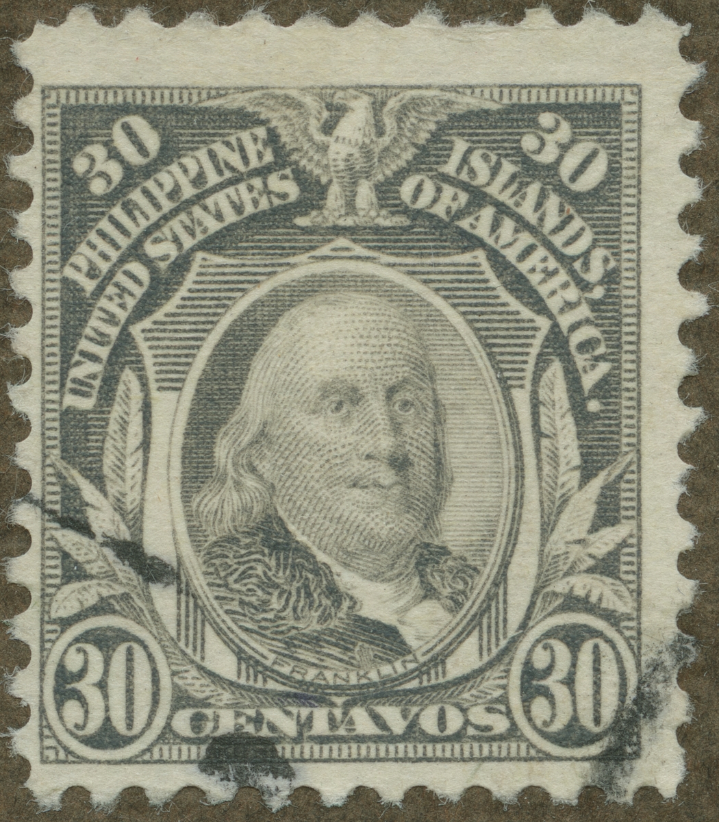 Frimärke från Filippinerna, 1906. Motiv av Benjamin Franklin 1706-1790 Boktryckare Generalpostmästare Fysiker: Åskledaren Diplomat i London och i Paris