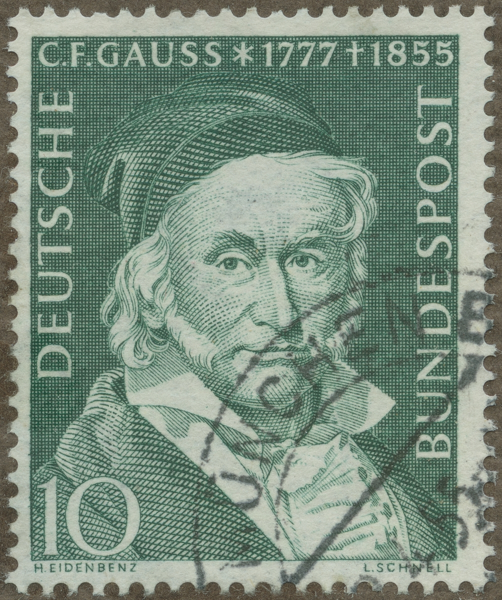 Frimärke från Tyskland, 1955. Motiv av Carl Friedrich Gauss: 1777-1855. Astronom. Observatoriet i Göttingen. Jordmagnetismen. Minsta kvadratmetoden. Komplexa tal. -100-årsminnet av hans död: 1855-1955-