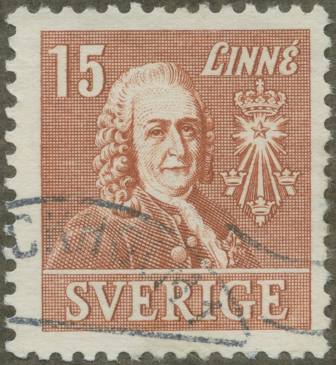 Frimärke från Sverige, 1939. Motiv av Carl von Linné 1707-1778 Botaniker Växtsystematiken Reseskildrare (inom Sverige) Vetenskapsakademiens 200 årsminne