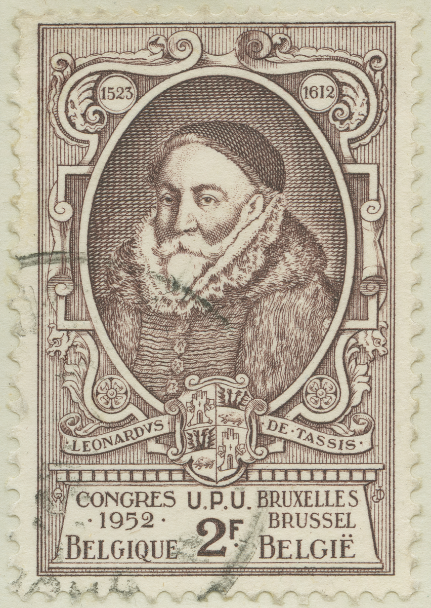 Frimärke från Belgien, 1952. Motiv av Baron Leonardus de Tassis: 1523-1612. -pionjär inom belgiska postväsendet Postkongress i Bryssel.
