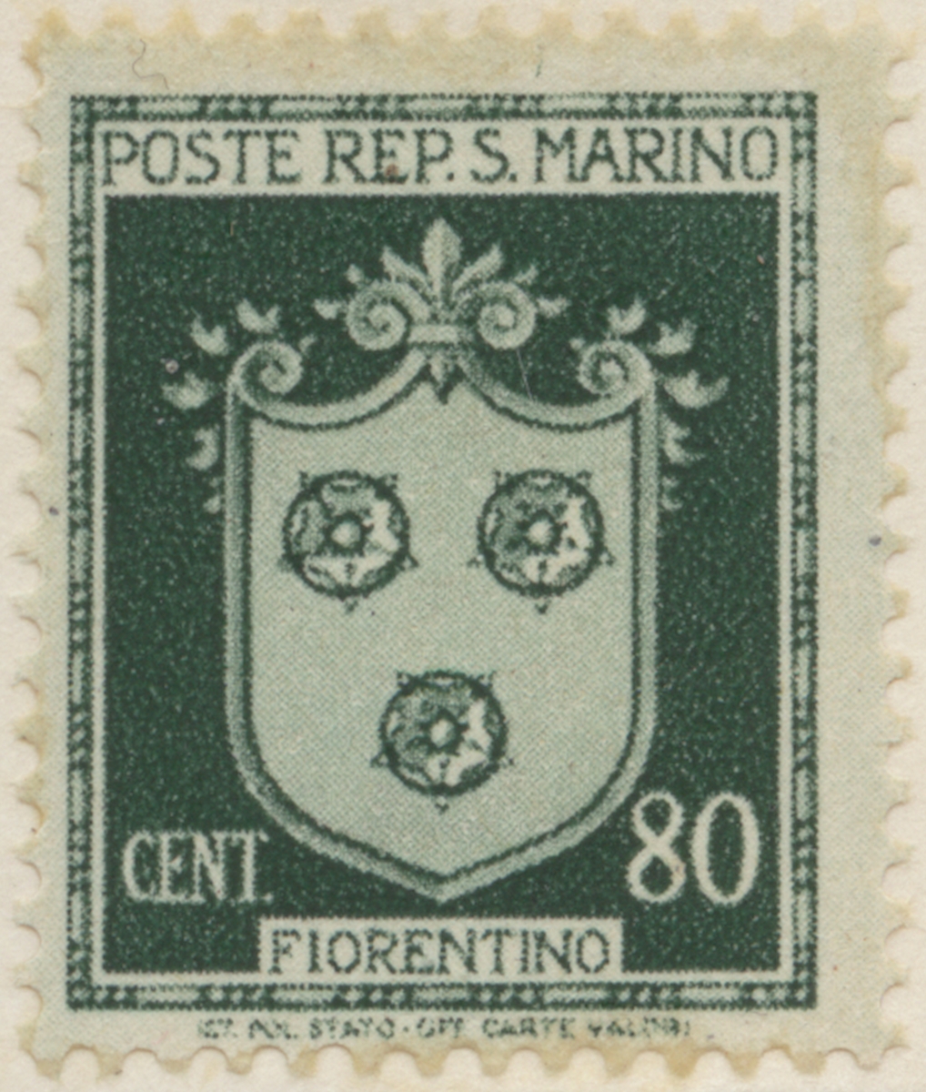 Frimärke från San Marino, 1945. Motiv av Fiorentinos Vapen