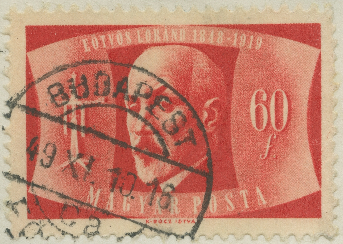 Frimärke från Ungern, 1948. Motiv av Baron Loránd v. Eötvös: 1848-1919 Ungersk vetenskapsman. Blev 1875 professor i experimental fysik vid Budapest Universitet. Forskning om: kapillaritet tyngdkraften jordmagnetismen.