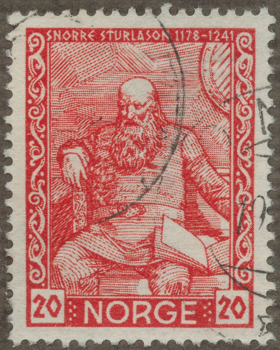 Frimärke från Norge, 1941. Motiv av Snorre Sturlasson 1178-1241 Isländsk skald och författare 700-årsminnet av hans död 1241-1941.