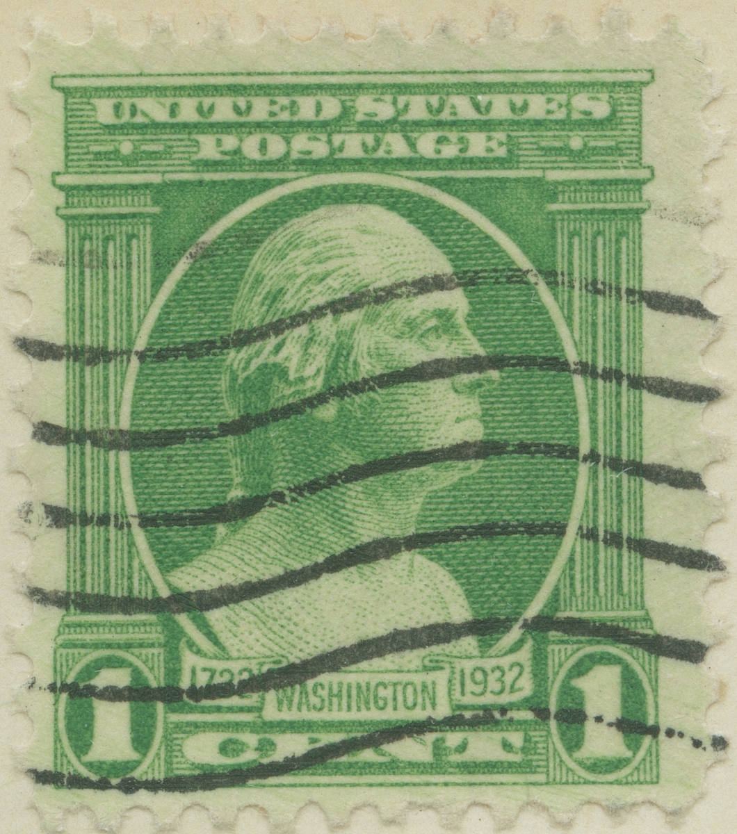 Frimärke från U.S.A., 1932. Motiv av Byst: George Washington av fransmannen Jean-Antoine Houdon: 1741-1828.