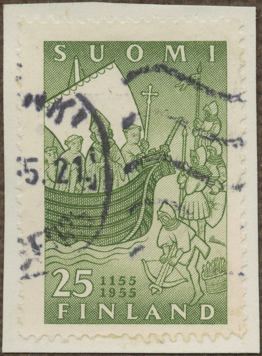 Frimärke från Finland, 1955. Motiv av Erik den Helige på resa till Finland 1155 800-årsminne