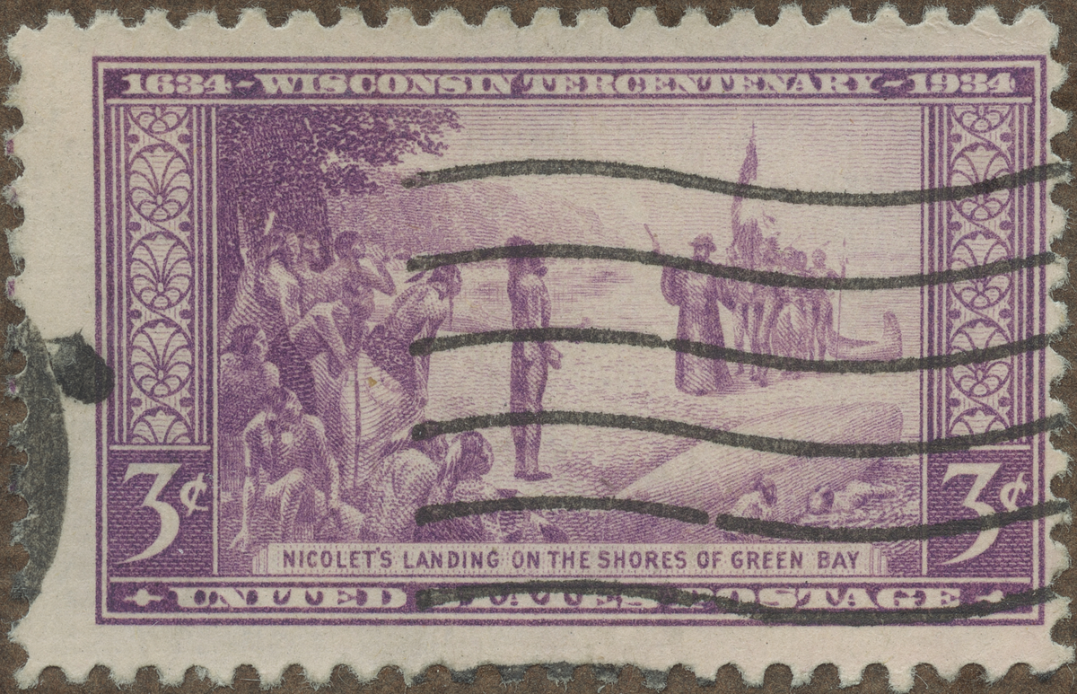 Frimärke från U.S.A., 1934. Motiv av Fransmannen Jean Nicolet landstiger vid Green Bay, Wisconsin 1634 -första vita man i Wisconsin trakten- 300-årsminne