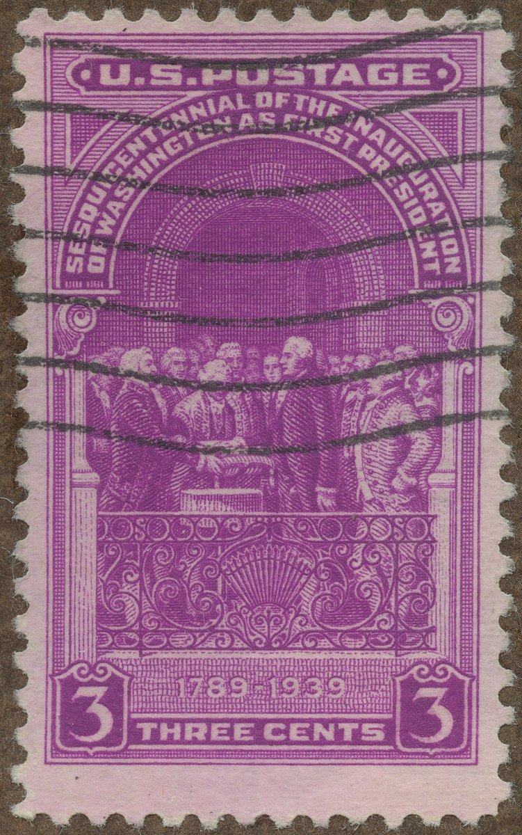 Frimärke från U.S.A., 1939. Motiv av General George Washington avlägger ämbetseden vid hans installation som USA:s första president i New York City, 1789. -150 årsminne-