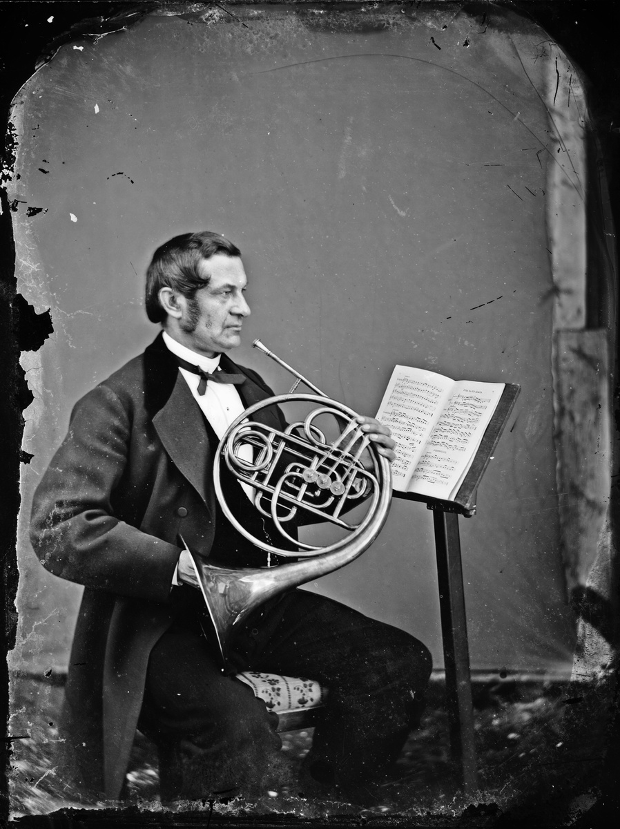Ateljéfotografi, våtplåt, kollodiumnegativ, musiserande man spelande på valthorn.