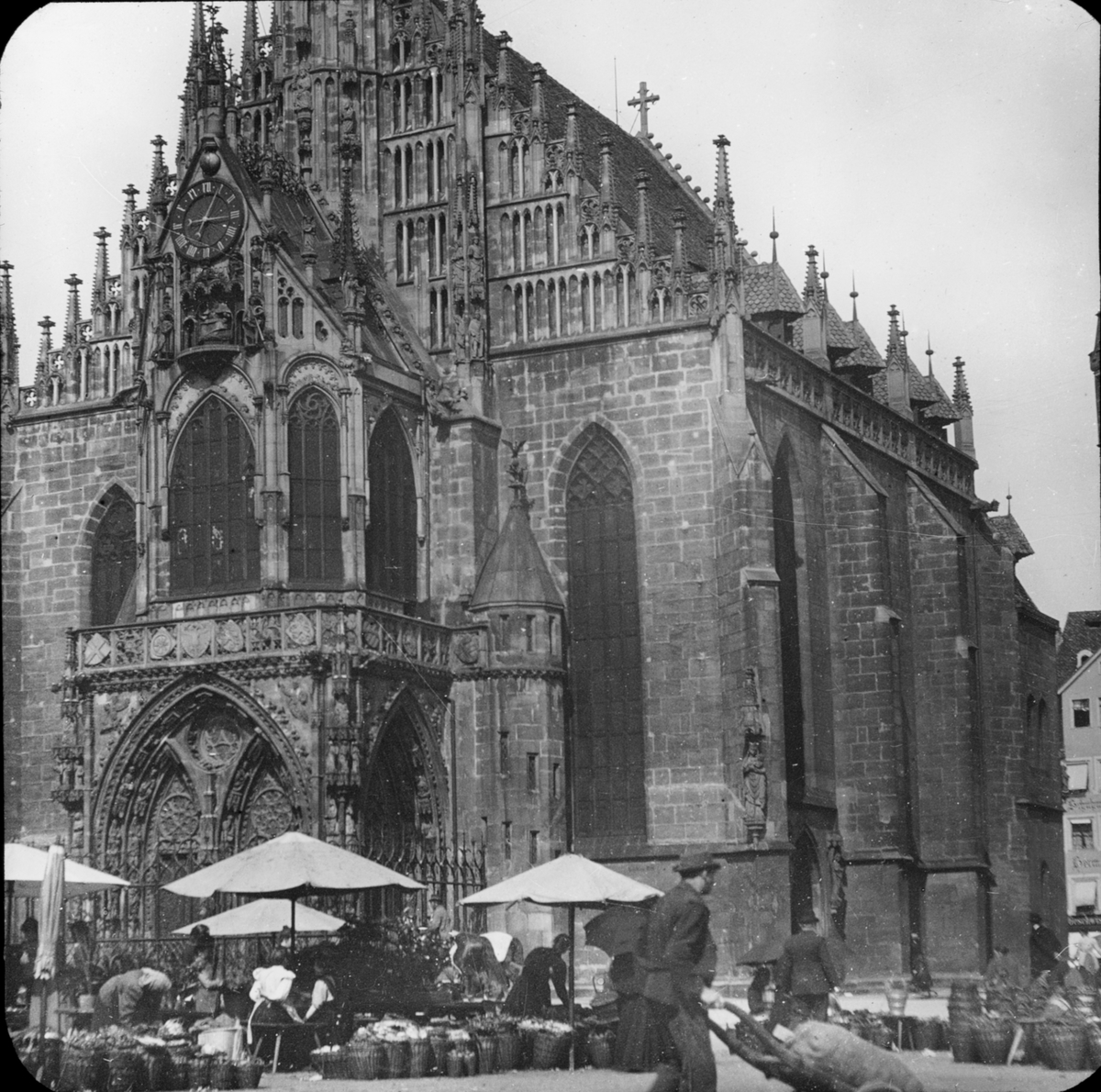 Skioptikonbild med motiv av marknad framför Die Frauenkirche i Nürnberg.