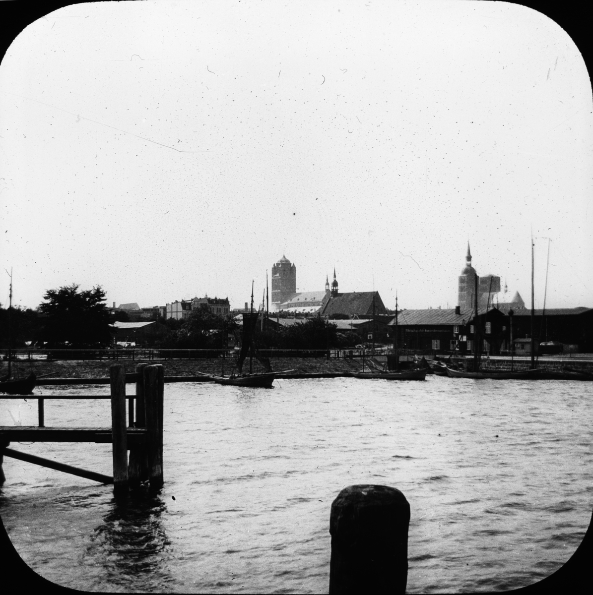 Skioptikonbild med motiv av hamnen i Stralsund. I bakgrunden skymtar kyrkorna St Nikolai Kirche och St Jakobi Kirche.