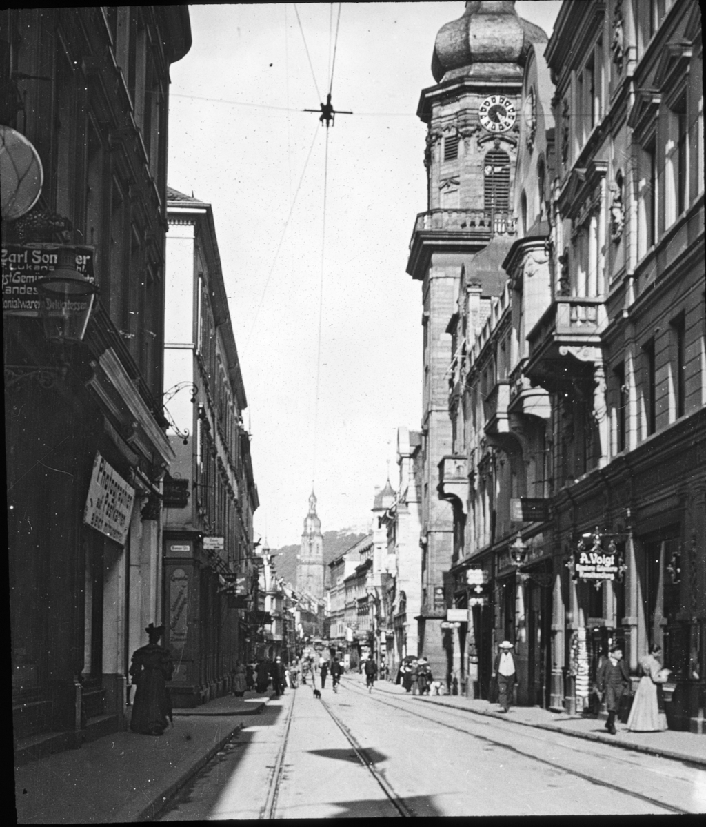 Skioptikonbild med motiv från Heidelberg, Hauptstrasse vid Providenzkirche.