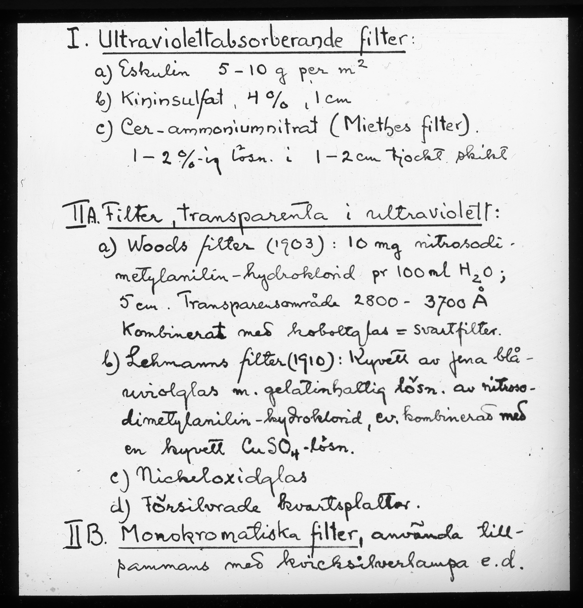 Skioptikonbild från Institutionen för fotografi vid Kungliga Tekniska Högskolan. Använd av professor Helmer Bäckström som föreläsningsmaterial. Bäckström var Sveriges första professor i fotografi vid Kungliga Tekniska Högskolan i Stockholm 1948-1958.