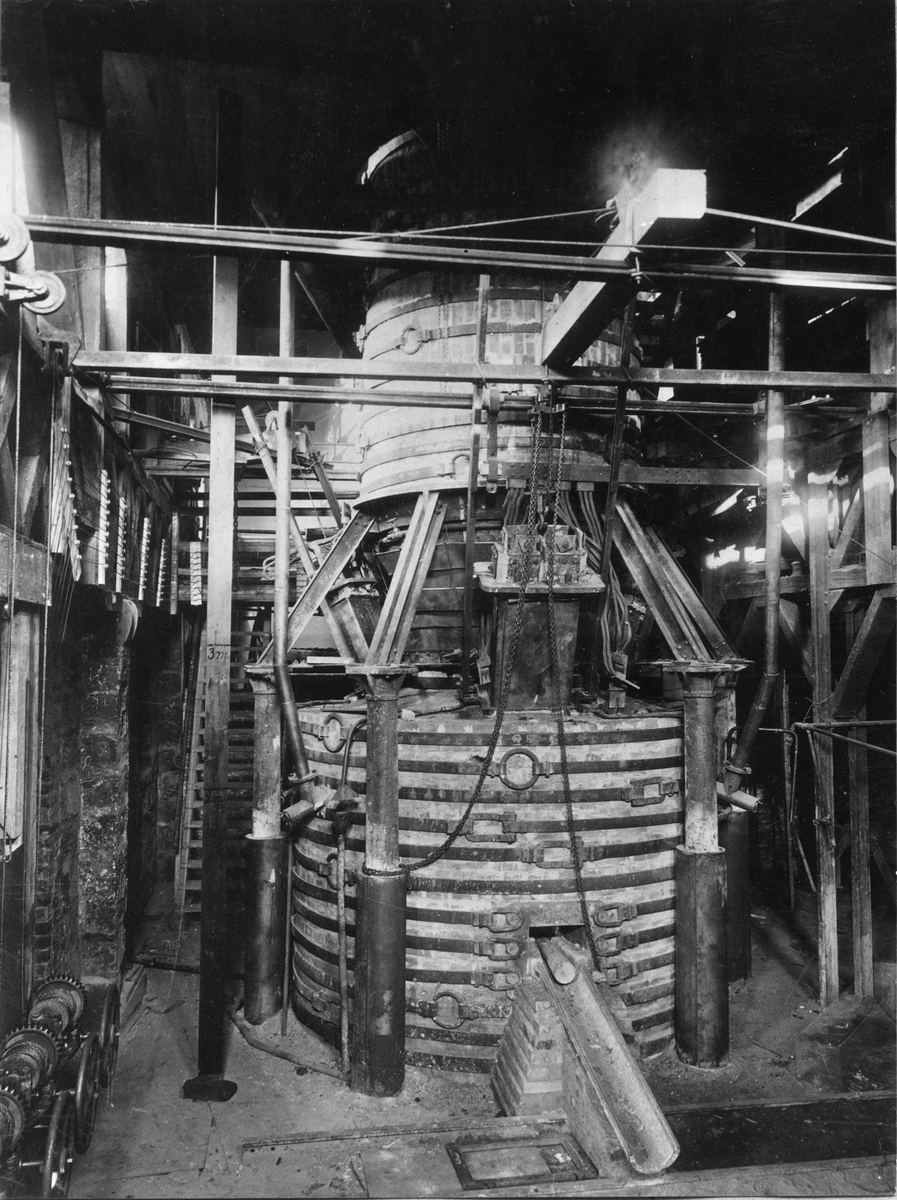 Elektrometalls första användbara masugn. Ugnen provades i Domnarvet från 2- 27 juli 1908, 27-30 december 1908 och 7 maj- 31 juli 1909. Max 800 hkr. Medeltal 470 hkr. AB