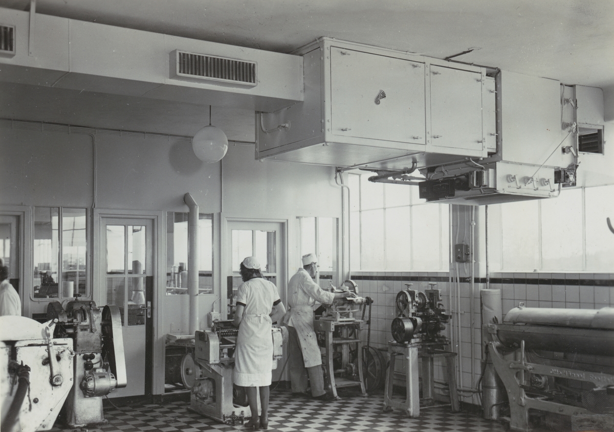 "Luftkondineringsapparat "Klimator" för konditionering i chokladfabrik. Den är monterad i taket och direkt ansluten till fördelningstrummorna för den behandlade luften. Till höger synes det automatiskt manövrerade blandningsskåpet, i vilket ytterluft och returluft blandas i väl avvägda propotioner".