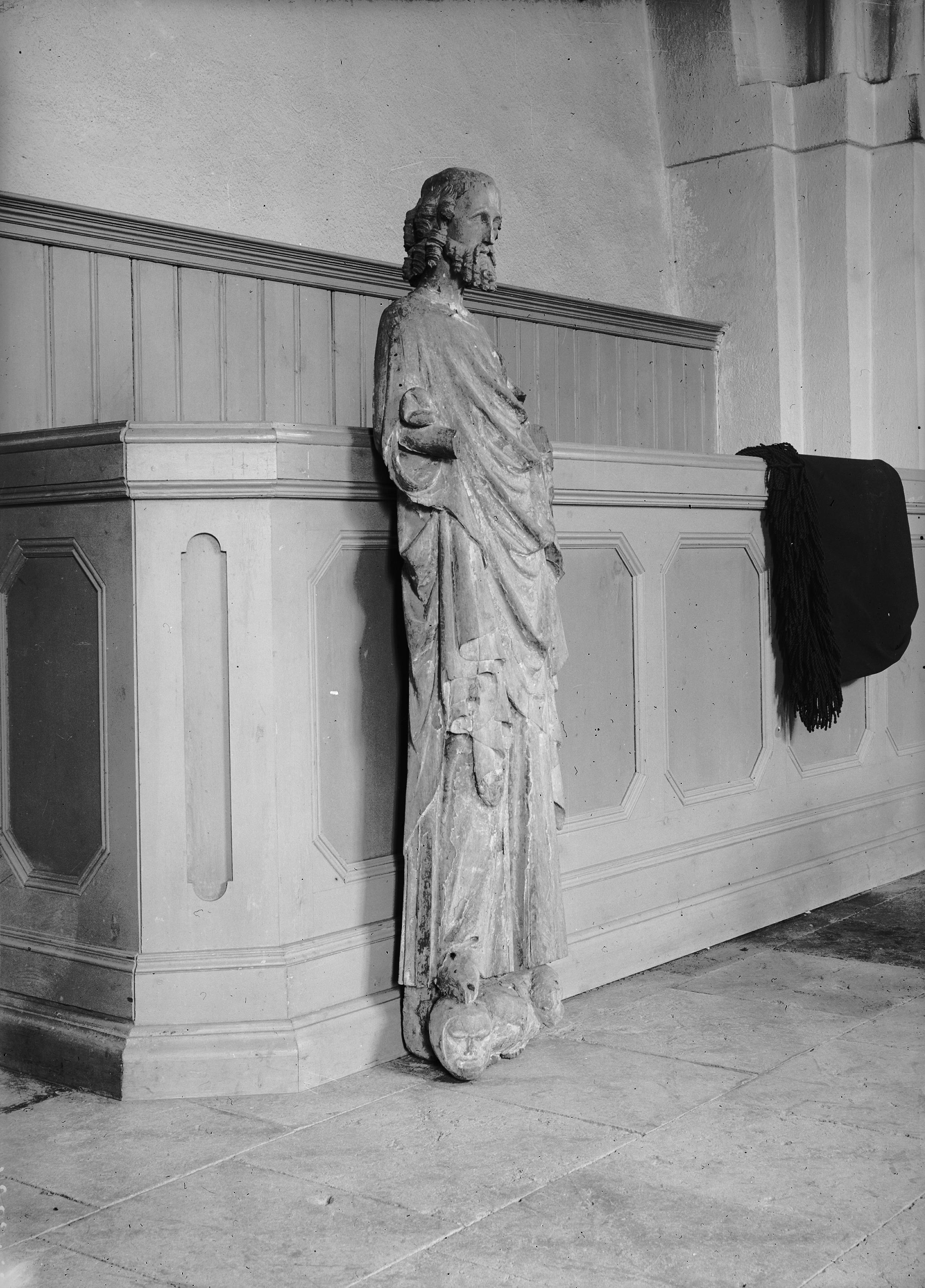 En skulptur av S:t Olof. Bild av ek: står på skalle. Bevarade rester av polykromin visar att manteln varit i guld med brokadmönster. Huvudet skulpterat runtom, ryggen urhålkad. Svenskt-franskt arbete från 1300-talets början (snabbinv). Saknar armar.