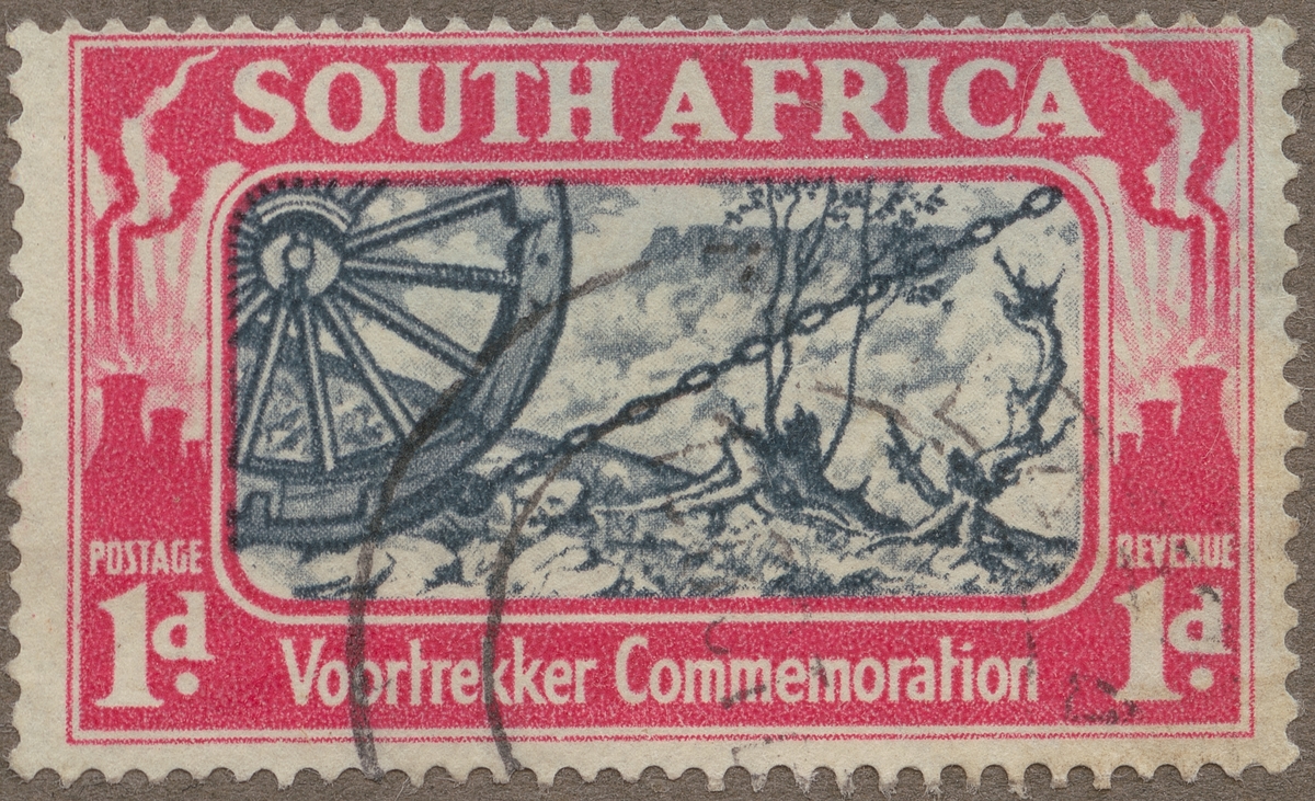 Frimärke ur Gösta Bodmans filatelistiska motivsamling, påbörjad 1950. Frimärke från Sydafrikanska Unionen, 1938. Motiv av Hjul till en transportvagn av det slag som de första boerna använde vid utvandringen till Sydafrika. "Till minne av boerpionjärerna."