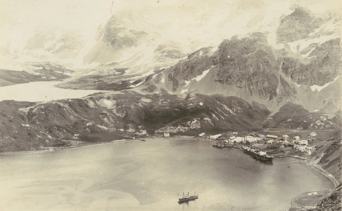 Bild från expedition i Antarktisområdet. Vy över Grytviken med hav, berg och båtar, 1927.