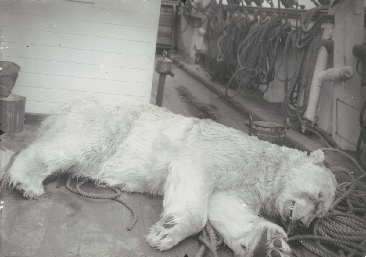 Diverse bilder ur Fred Goldbergs samling. Motiv av död isbjörn ombord på båt.