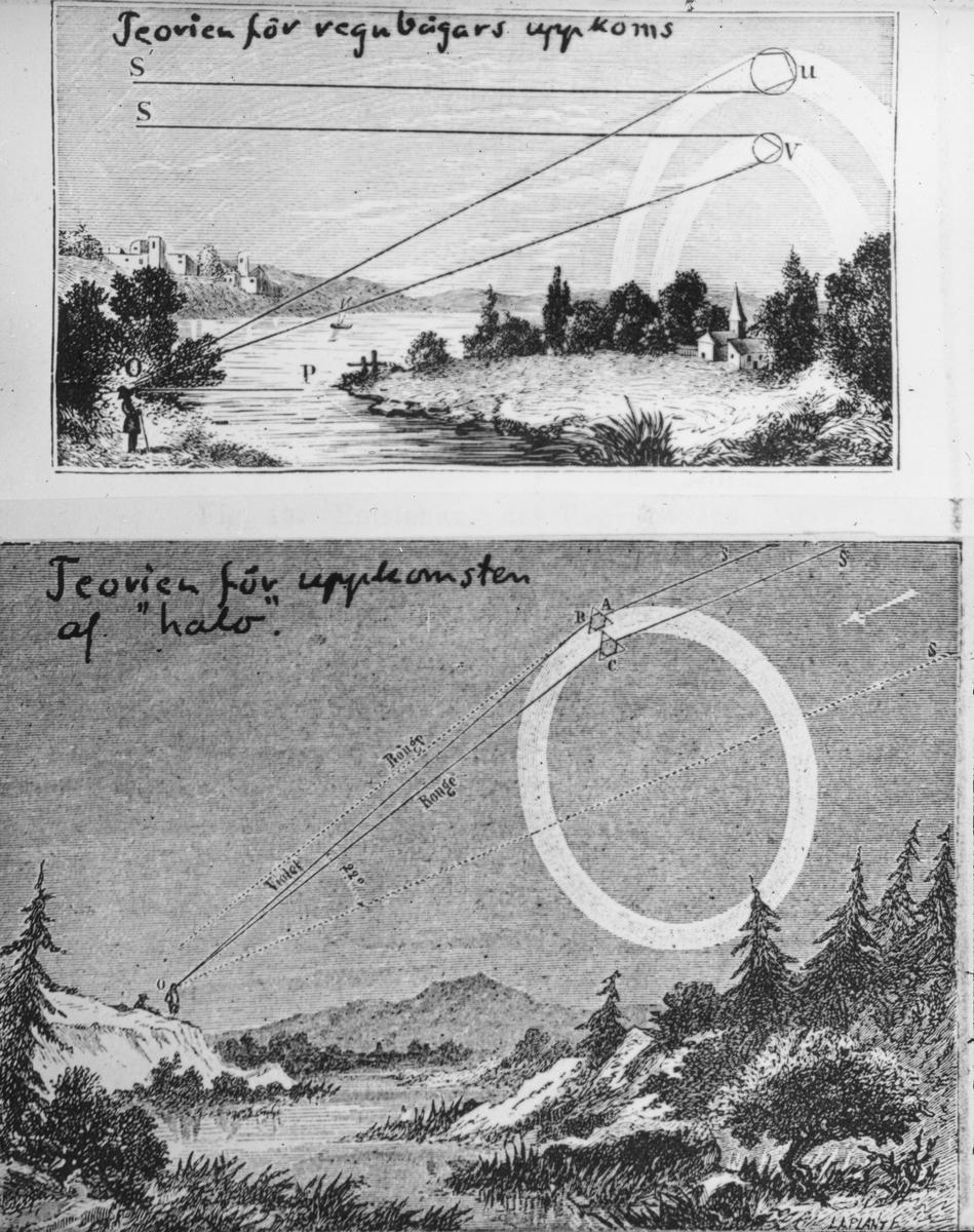 Skioptikonbild med motiv rörande olika typer av väderfenomen.Teorier för uppkomsten av halo.