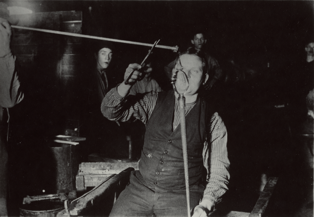 Titel: Tillverkningsstadie vid glasframställning även tratt, ett drivet vinglas mm. Ur album: Limmareds Glasbruk 1740-1902-1930.