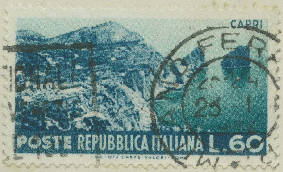 Frimärke ur Gösta Bodmans filatelistiska motivsamling, påbörjad 1950. Frimärke från Italien, 1953. Motiv av Capri Klippan
