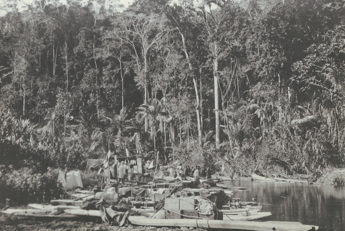 Fotografi från kuvert märkt med "Ernst Nordenskjöld". Läger i djungeln vid flod.