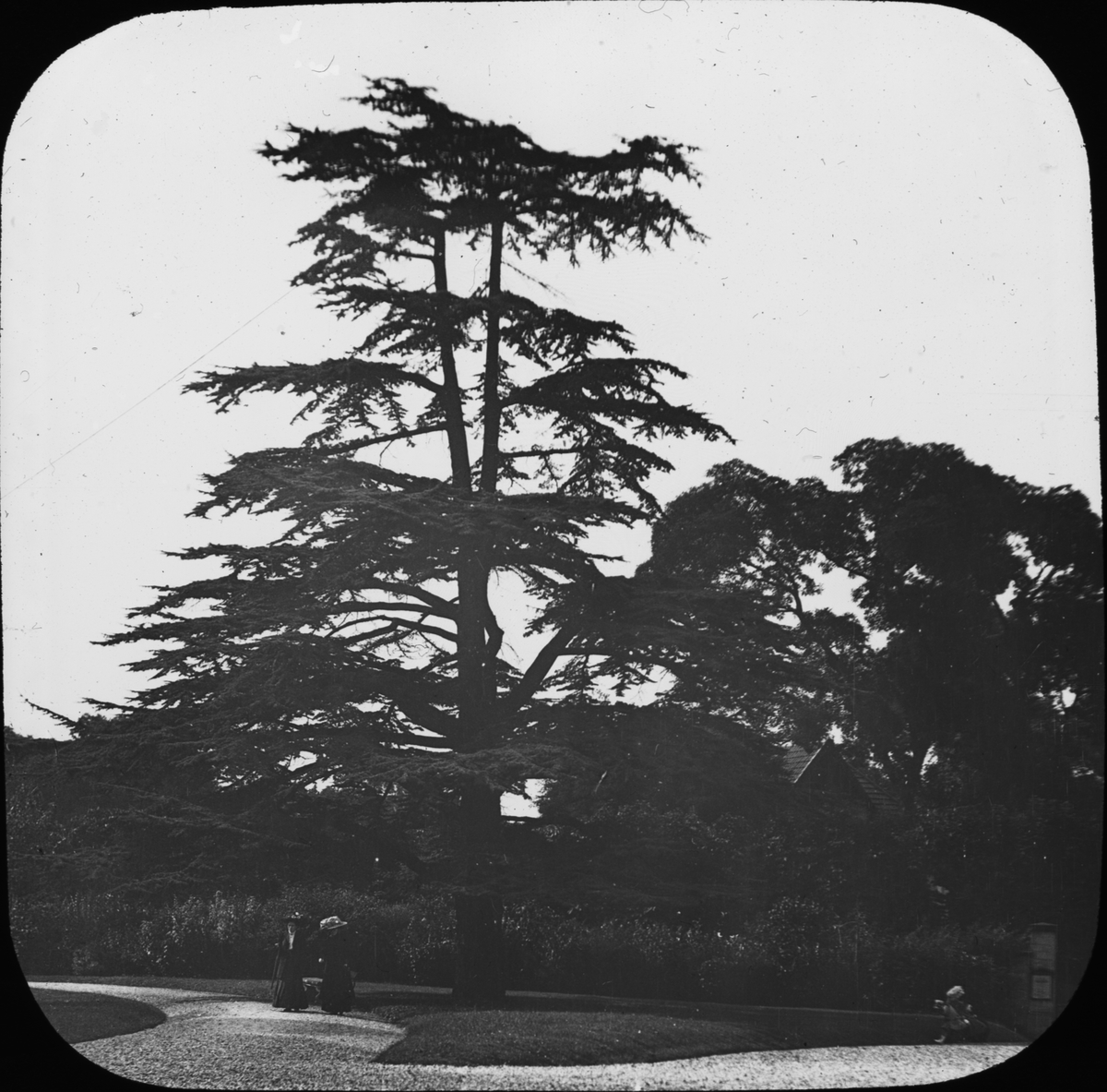 Skioptikonbild med motiv av två kvinnor vid cederträd i parken vid Château La Malmaison.