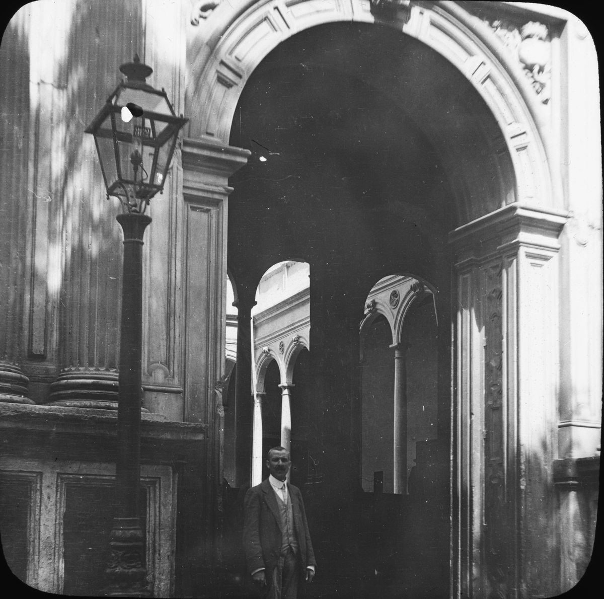 Skioptikonbild med motiv av Sigurd Curman vid porten in till Audiencia Chaneilleria.