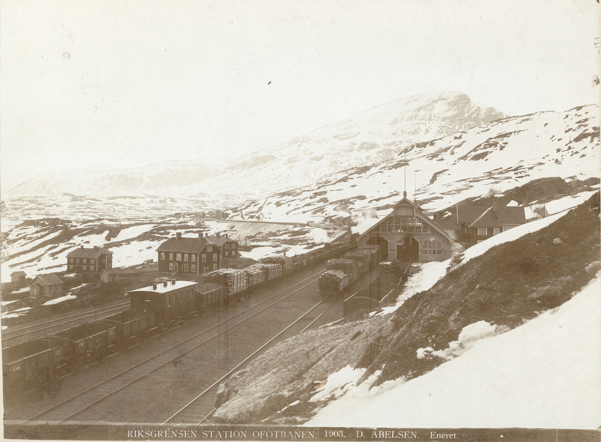 Riksgränsens järnvägsstation, Ofotenbanan, i vårsnö.