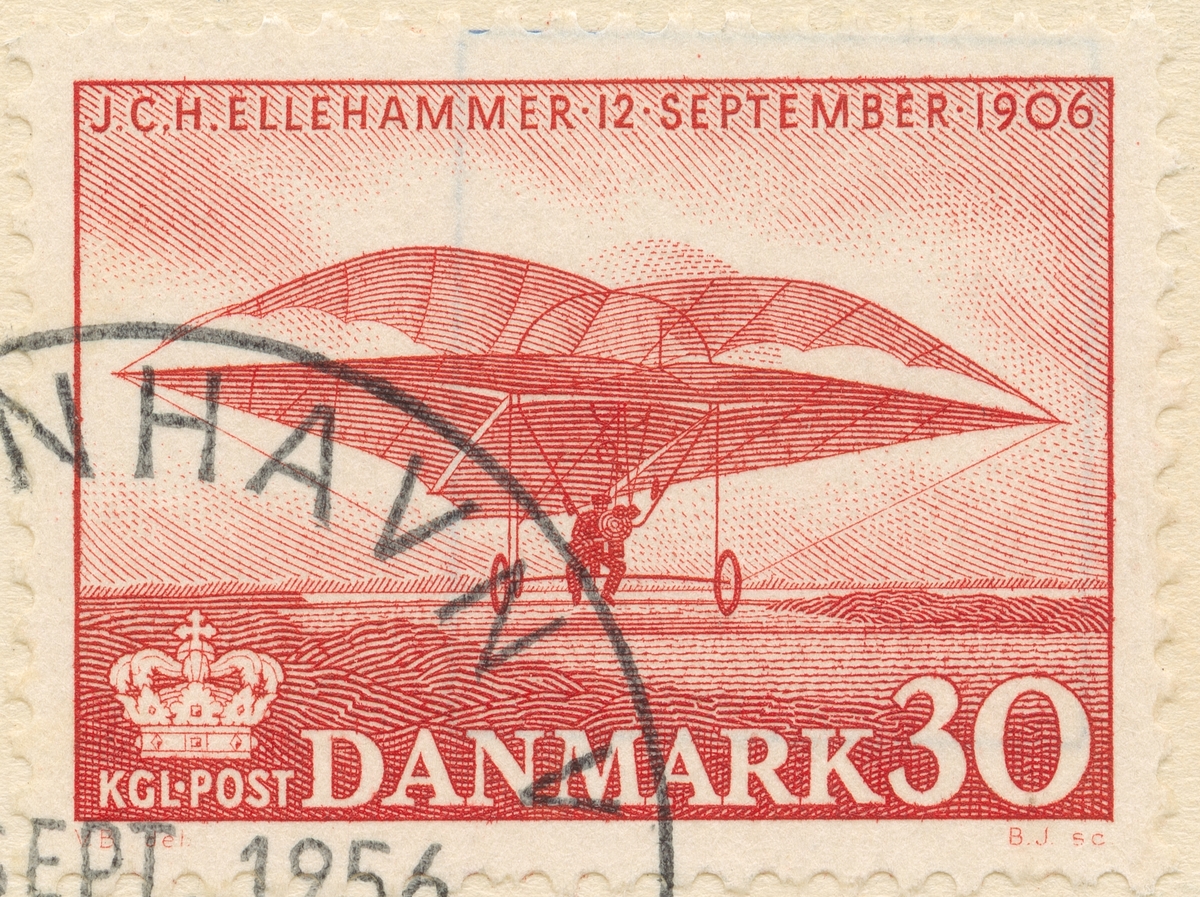 Frimärke från Danmark, 1956. Motiv av tidigt flygplan, J.C.H. Ellehammer, 12 september 1906. Dansk ingenjör och uppfinnare. Den första flygningen 50 års-minne. "Förstadagsbrev" från Danmark 1956.