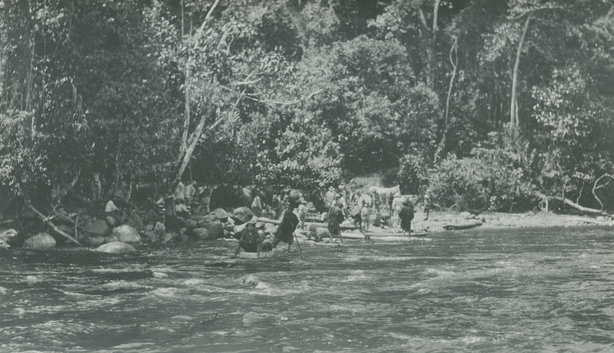 Fotografi från expedition till Peru 1920. Motiv av expeditionsdeltagare vid flod i djungeln.